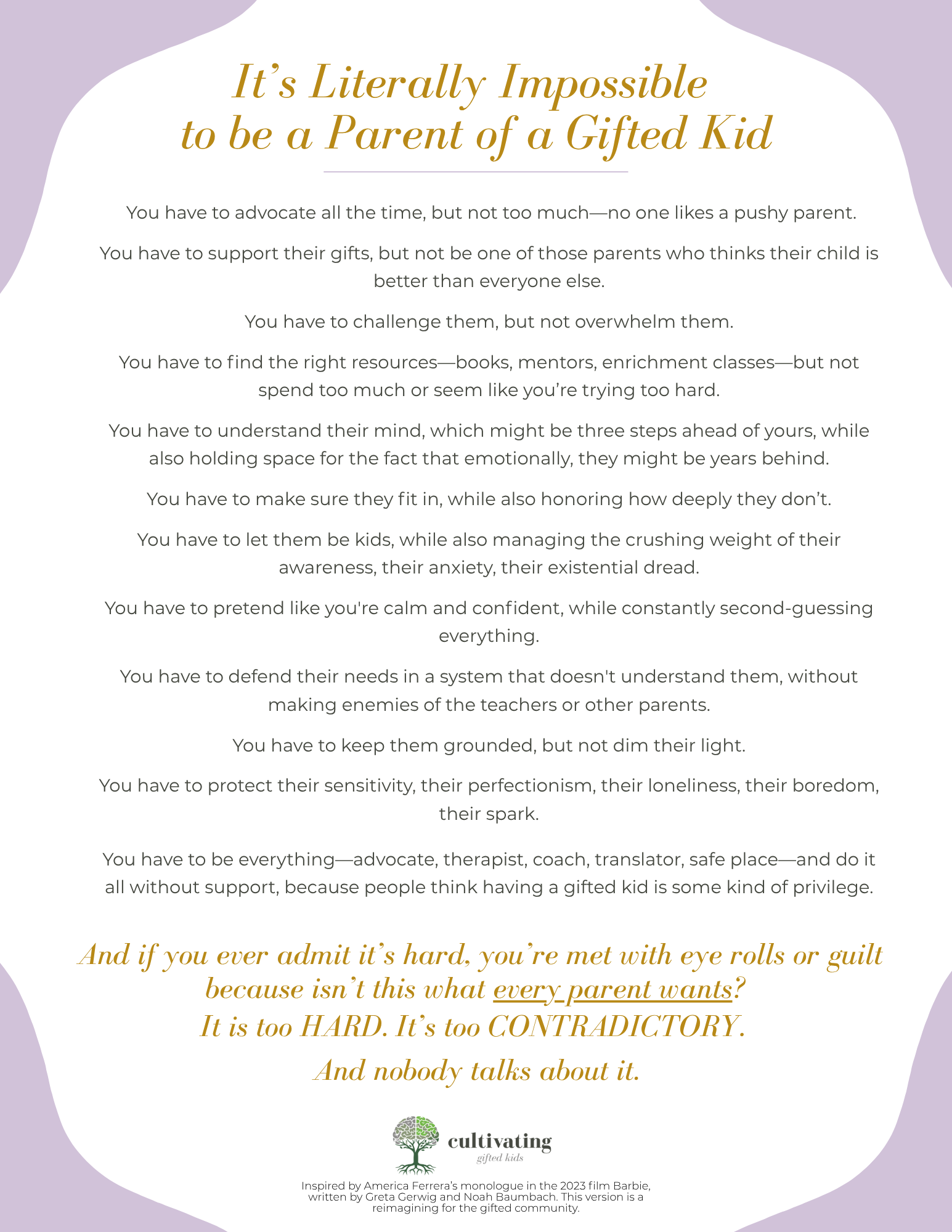 You have to be everything—advocate, therapist, coach, translator, safe place—and do it all without support, because people think having a gifted kid is some kind of privilege.