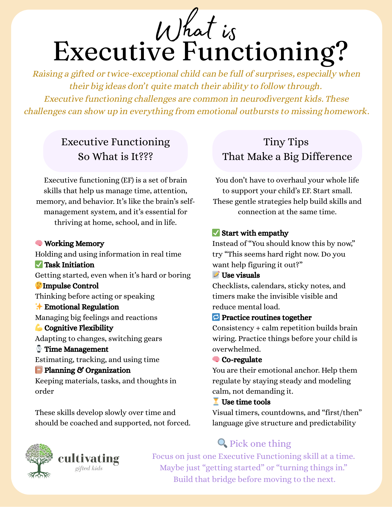 I created a free one-page executive functioning guide just for you. It breaks down the basics of EF and offers tiny, doable tips to help you get started. It's part of my free resource library for parents of gifted and twice-exceptional kids.